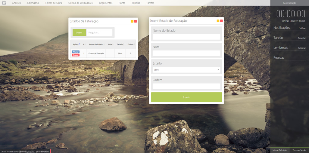 Para qualquer tabela existem as opções de inserir, alterar e apagar. Simplesmente clique no botão referente à ação e siga os passos. Depois é só clicar no botão de guardar para registar as alterações.