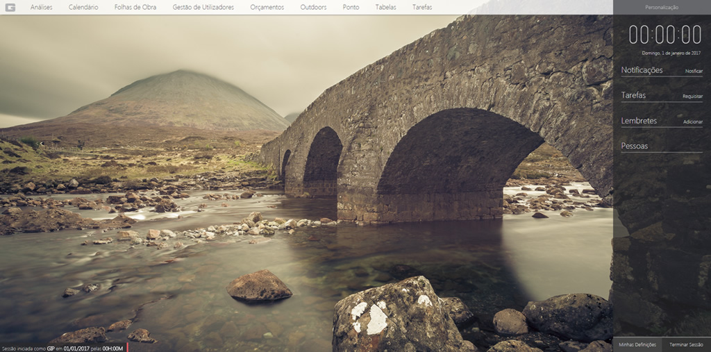 Na barra lateral encontra diversas funcuinalidades e aplicativos. Tem uma vista rápida de notificações e tarefas a si atribuídas e ainda pode ter os seus lembretes e enviar mensagens a outros utilizadores do GIP. Pode ainda customizar o seu fundo em Personalização e alterar as suas definições e terminar a sessão nos botões em baixo respetivamente. Por cima destes botões consegue ver ainda uma barra horizontal que muda de cor consoante a conexão à internet.