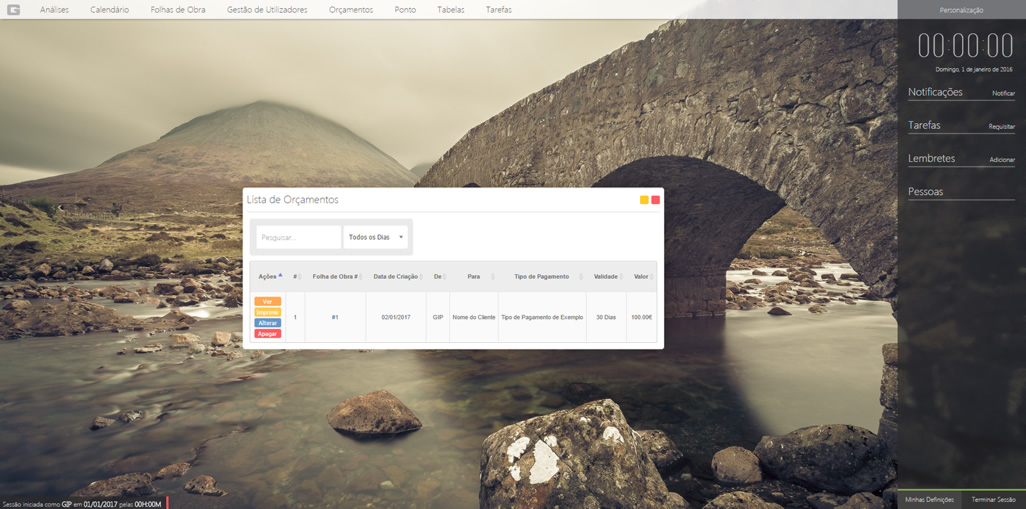 Na lista de orçamentos pode ver todos os orçamentos criados e alguma breve informação relativa aos mesmos. Tem ainda as opções de ver e imprimir além das habituais alterar e apagar.