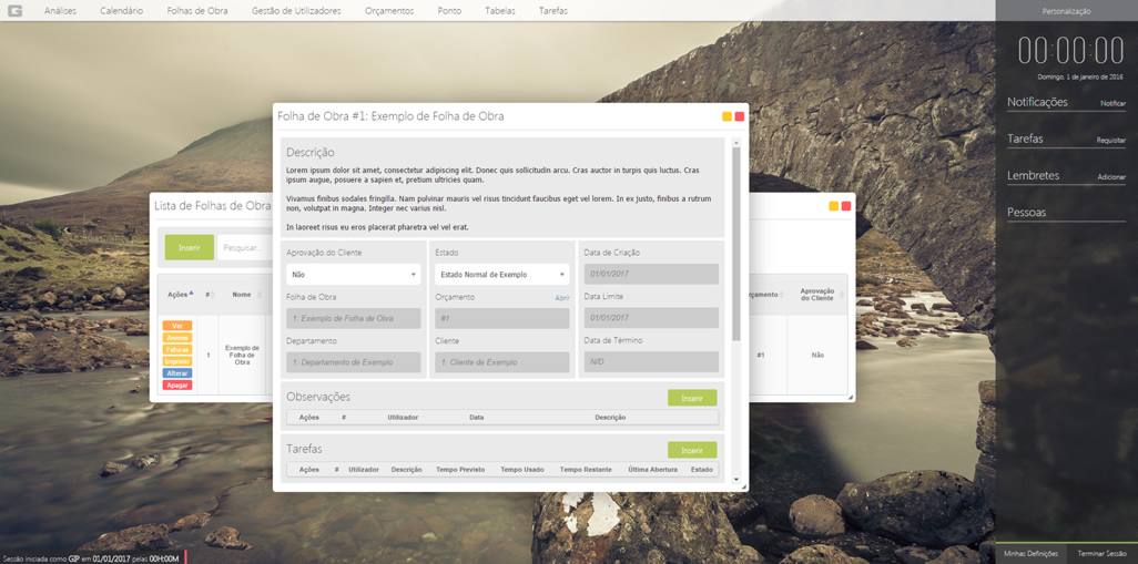 Nas observações pode inserir e apagar observações relacionadas a esta folha de obra.