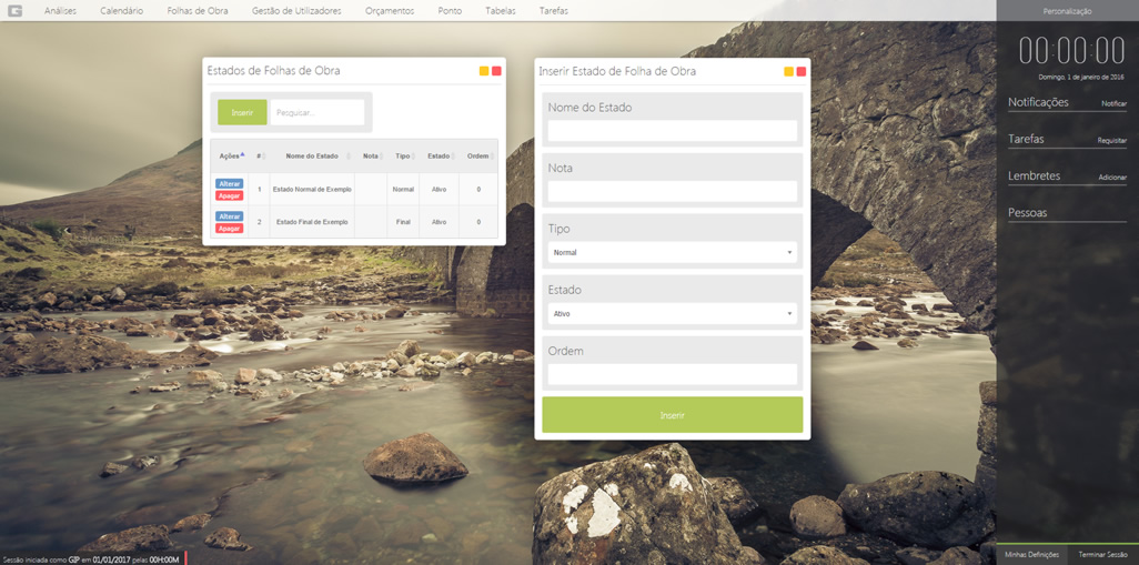 Para qualquer tabela existem as opções de inserir, alterar e apagar. Simplesmente clique no botão referente à ação e siga os passos. Depois é só clicar no botão de guardar para registar as alterações. O único campo que é necessário ter em atenção é o "tipo". Se definir um estado como "final", ao alterar o estado da folha de obra para esse estado ela assume automaticamente a data atual como data final.