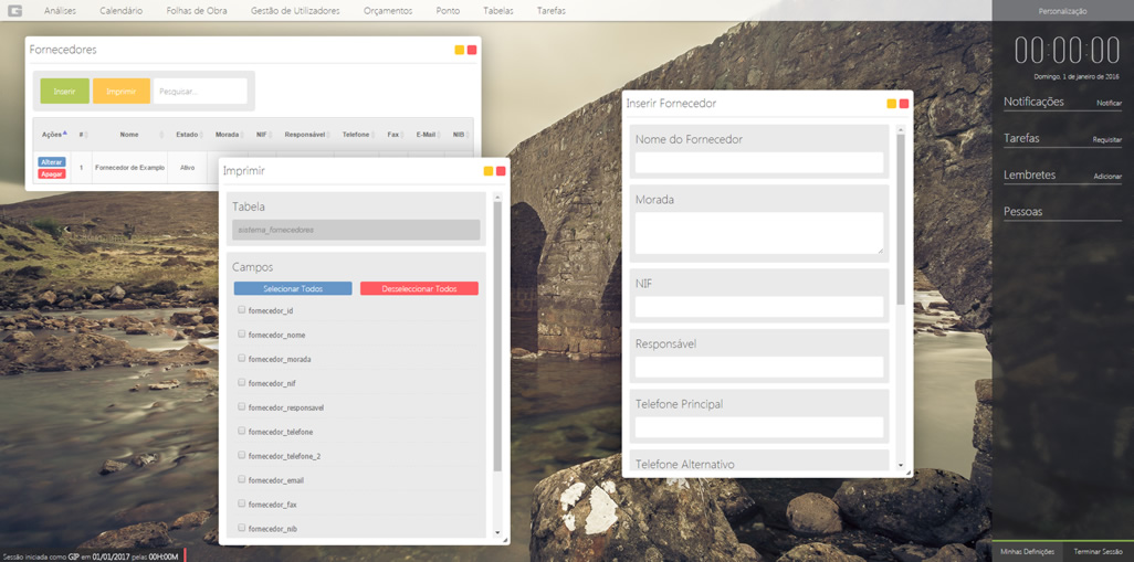 Para qualquer tabela existem as opções de inserir, alterar e apagar. Simplesmente clique no botão referente à ação e siga os passos. Depois é só clicar no botão de guardar para registar as alterações. Nos fornecedores tem ainda a opção "imprimir" onde pode escolher os campos que quer ver na página a imprimir e posteriormente proceder à impressão.
