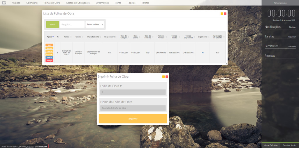 As folhas de obra podem ser imprimidas através desta funcionalidade. As informações disponíveis ao imprimir são as informações básicas, observações e tarefas relacionadas.